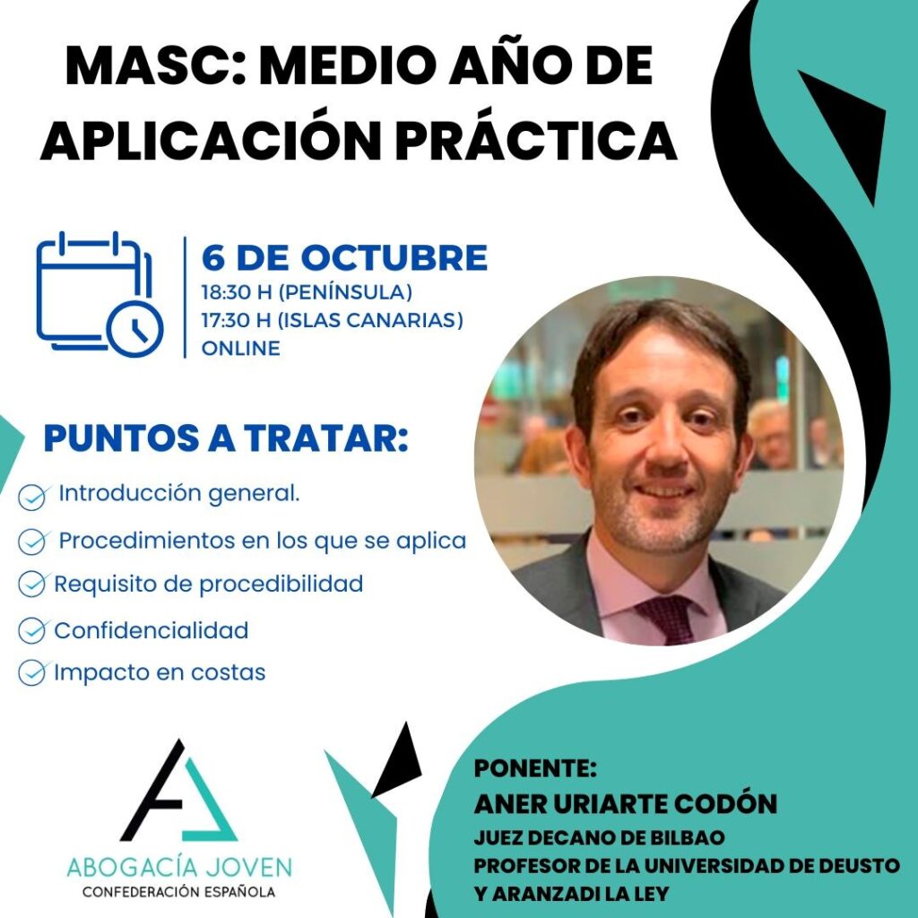 La Confederación Española de la Abogacía Joven organiza, el próximo lunes 6 de octubre a las 18:30 de forma online una jornada de formación sobre MASC: medio año de aplicación práctica, tendremos como ponente a Aner Uriarte Codón. Juez Decano de Bilbao. Profesor de la Universidad de Deusto y Aranzadi LA LEY. Inscripción en el siguiente enlace: […]