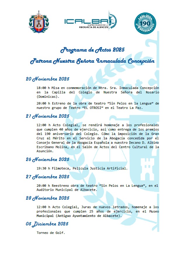 El Ilustre Colegio de la Abogacía de Albacete organiza una Jornada de Formación en Derecho Penitenciario: “LUCES Y SOMBRAS DEL RÉGIMEN PENITENCIARIO”, que tendrá lugar el próximo 18 de noviembre en el Salón de actos del Colegio a las 17:00 horas. Esta Jornada se celebra de forma presencial en el Salón de Actos del Ilustre […]