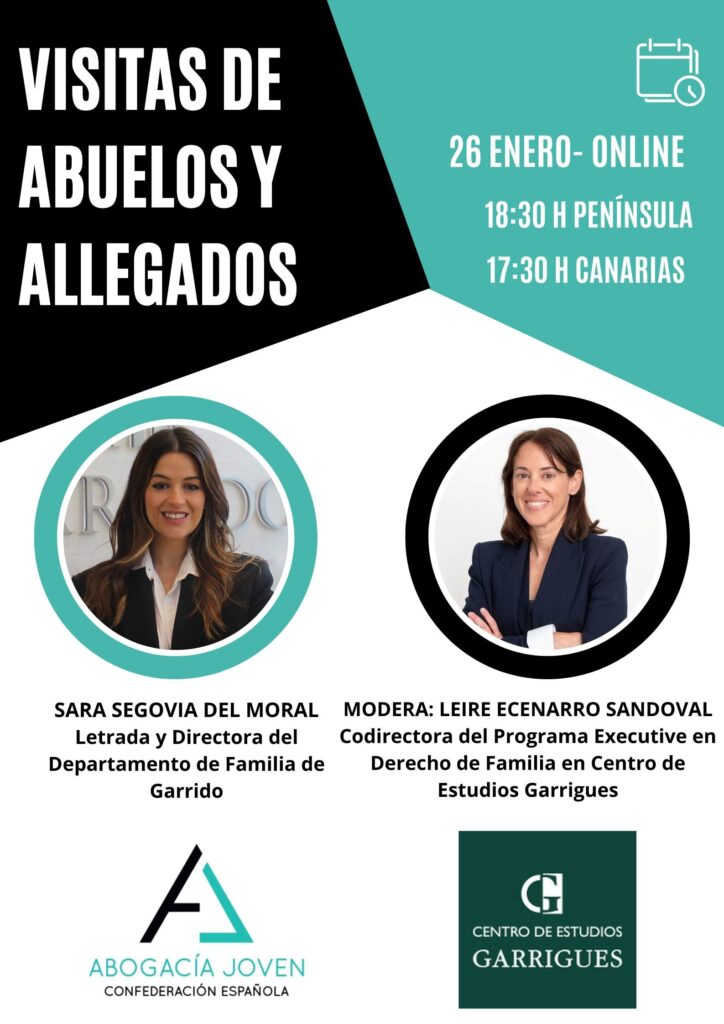 La Confederación Española de la Abogacía Joven organiza, el próximo lunes 26 de enero a las 18:30 de forma online una jornada de formación sobre las Visitas de abuelos y allegados: criterios judiciales actuales y evolución jurisprudencial, tendremos como ponente a Sara Segovia del Moral. Letrada y Directora del Departamento de Familia de Garrido.